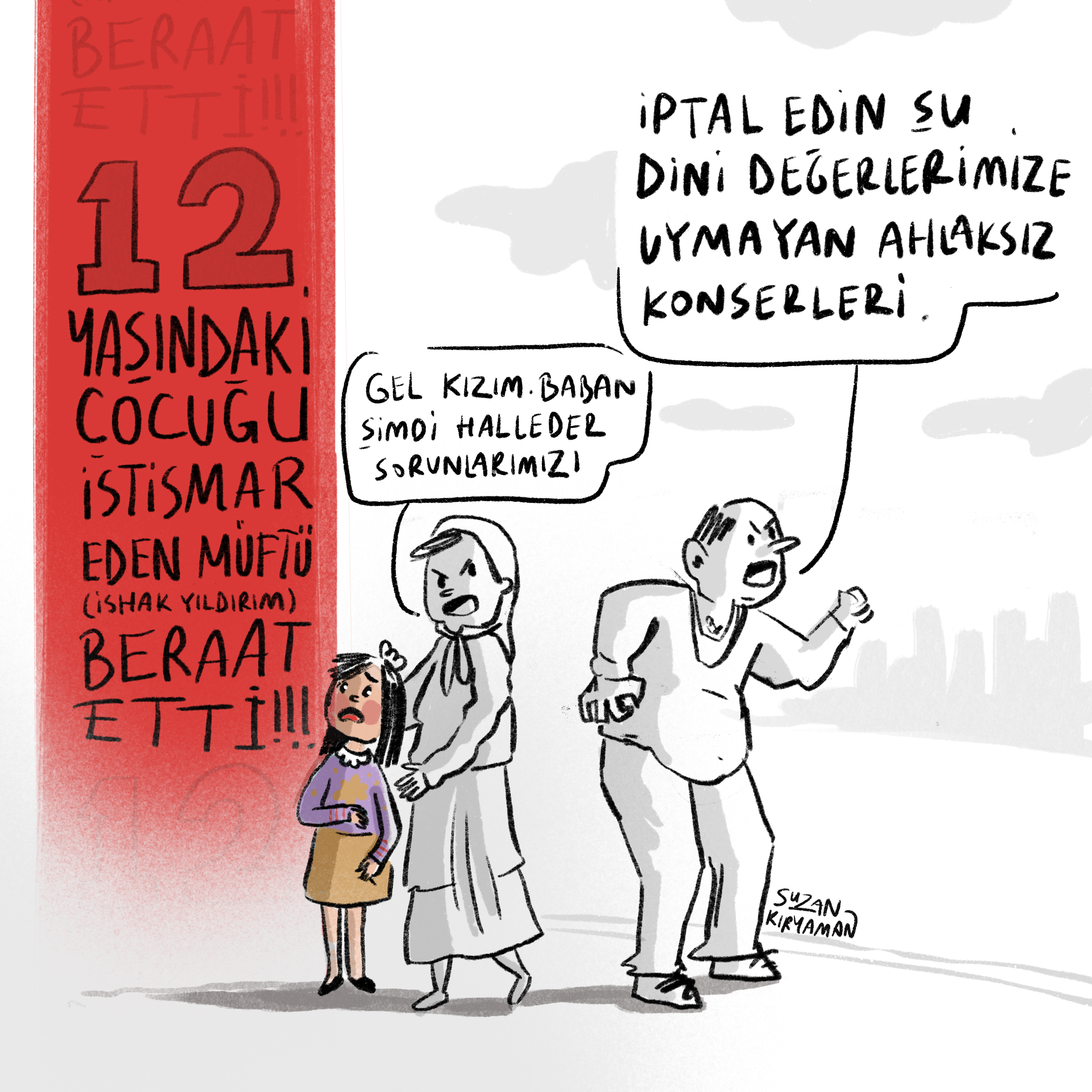 Görsel betimleme: Çizimin sol tarafında: “12 yaşındaki çocuğu istismar eden müftü (İshak Yıldırım) beraat etti!!!” yazıyor. Ortada başörtülü bir kadın küçük bir kızı elinden tutmuş. Kadın kıza dönerek: “Gel kızım, baban şimdi halleder sorunlarımızı!” diyor. Sağda öfkeli ve saldırgan görünen bir adam eliyle işaret ederek bağırıyor: “İptal edin şu dini değerlerimize uymayan ahlaksız konserleri.”