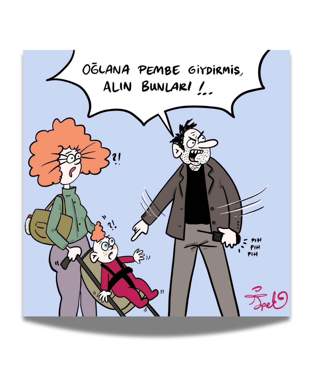 Görsel betimleme: Bu karikatürde üç karakter yer alıyor: bir kadın, bir bebek ve sinirli bir adam. Kadın şaşkın bir ifadeyle arabasındaki bebeğe bakıyor. Bebeğin pembe bir tulumu var. Kadın yeşil bir kazak, morumsu pantolon giyiyor ve sırtında bir çanta taşıyor. Bebek şaşırmış bir şekilde adamın yönüne bakıyor. Adam ise takım elbise giymiş, sinirli bir şekilde bağırıyor ve elinde telsiz tutuyor. Konuşma balonunda “OĞLANA PEMBE GİYDİRMİŞ, ALIN BUNLARI!!” yazıyor. Adamın hareket çizgileri onun agresif bir tavırla bağırdığını gösteriyor.